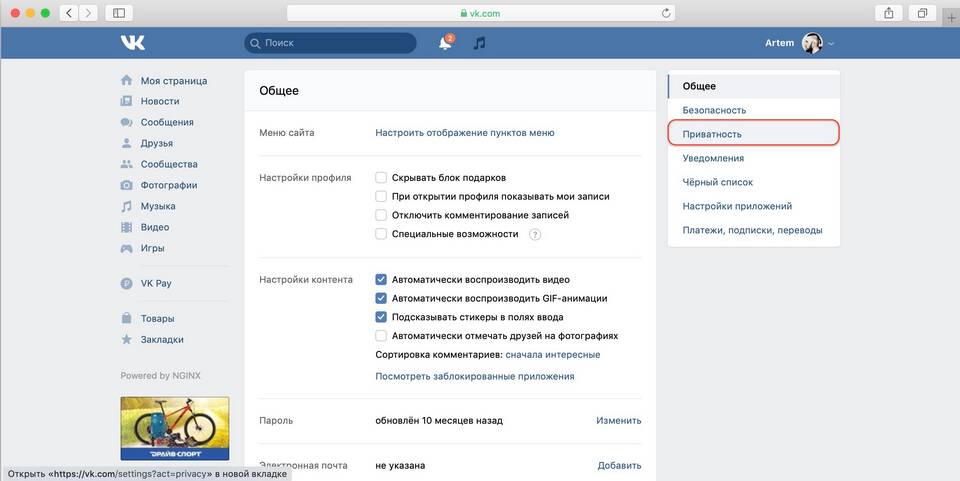 - Перейдите в раздел "Приватность"