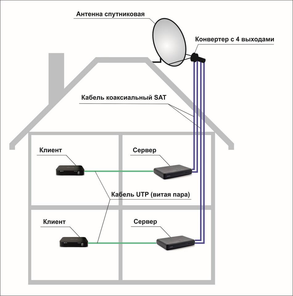 - Спутниковая тарелка → Кабель → Модем